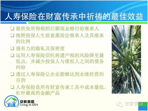 三,合理避税:人寿保险属于人力资产,没有所得税,外国人购买美国的人寿保险也没有遗产税,美国居民通过人寿保险信托也达到避免遗产税的功能,投资既避掉所得税又避掉遗产税的投资在美国绝无仅有。