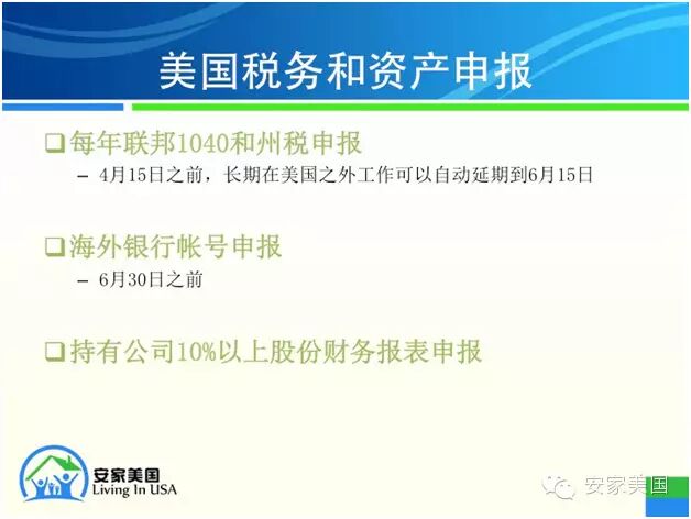 新移民的美国报税都报什么呢?主要有三部分:一是每年联邦1040和州税的申报,全年全球家庭收入达到12000美元就需申报联邦税,如果是加州的居民,又有来自纽约的EB5投资收入,两个州都要报州税。时间是4/15前报前一年全年的收入所得税。如果需要延期,可申请延期6个月,长居美国以外可自动延期两个月。二是海外银行账户和金融资产的申报,海外金融资产随联邦和州税一起申报,海外银行账户6/30前单独申报,不能延期。三是如果拥有企业股份10%,需申报企业资产负债表和损益表,随联邦和州税表一起申报。