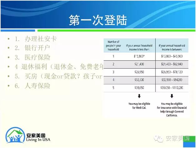 第三件事是购买美国的医疗保险。入乡随俗,在美国需要购买各种保险,医疗保险是是第一要考虑的。美国不但有先进的医疗技术和优质服务,从2014年推行的奥巴马健保更是众多新移民的福音,大部分新移民可以享受州政府的补贴,只用很少的保费就可享用美国很好的医疗保障。另外,奥巴马健保法案规定,如果在美国居住超过一个月而没有医疗保险,每个月每个人的罚款可达两三百美元;当然,如果确实在美国居住时间很少,要提前规划,当年来美时间不超过30天以避免罚款。