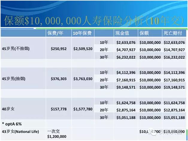 以上讲了美国保单这么多的优势、功能和作用,现在来看看与保单相关的问题:保费与年龄和健康状况息息相关,年龄轻,健康的人保费低,同时保额的确定与收入相关,对正当壮年的人来讲保额最多是收入的30倍。报税和买医疗保险时,大家都希望收入低,这样缴税少,医疗保险补助多,一旦报过税,保险公司在你购买保单时会掉你的税单,这时想买大额保单几乎没有可能。所以建议购买大额保单的移民要在报税之前做。附上美国保单的案例,供大家参考。