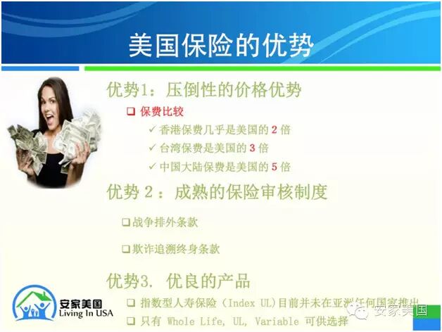 最后来谈一谈大额人寿保单。近年来为什么这么多人涌入美国购买美国保单?我们来看看美国保单的优势:一:性价比最好:同样的保额,香港的保费几乎是美国的两倍,大陆的是美国的3到4倍。二:成熟的核保制度,美国保险有近200年的历史,中国保单战争排外条款,因战争死亡不赔,美国没有;中国保单有欺诈追溯终身条款,美国追溯期两年;三:优良的产品。目前流行美国的指数保险以美国前500家大公司的标准普尔指数为参考,透明,回报好,下保底,是仅有的只赚不赔金融产品,且有几家公司可以卖给外国人。