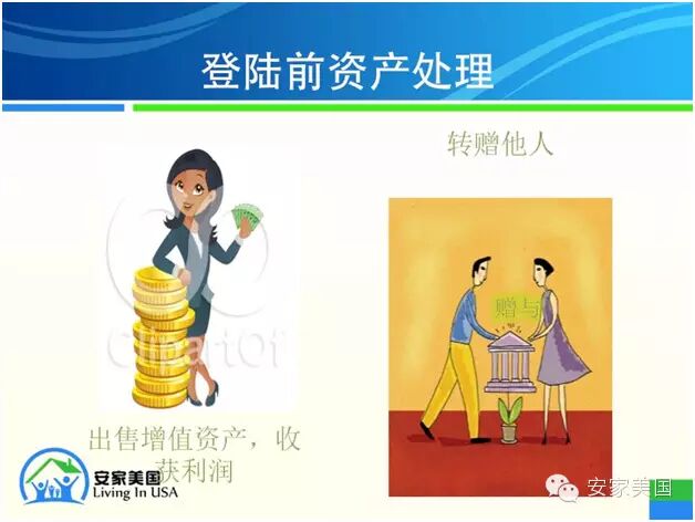 登陆前资产处理:美国征税的原则是针对已实现的收入征税,即财产在出售和转移时才征税,征税的基础是卖价减去买价,当然卖价可扣除手续费,买价可加上装修费,所得净值看投资时间长短按长期或短期税率征税,损失不但不缴税,还可抵扣其他投资所得税。在登陆前的投资已增值很多,建议卖掉变现,如果希望继续增值,可以卖掉再买回,这样征税的基础不同;也可以转移给不移民的父母和兄弟姐妹,等变现后现金赠与。属于这一类的有房产、股票、企业等投资。